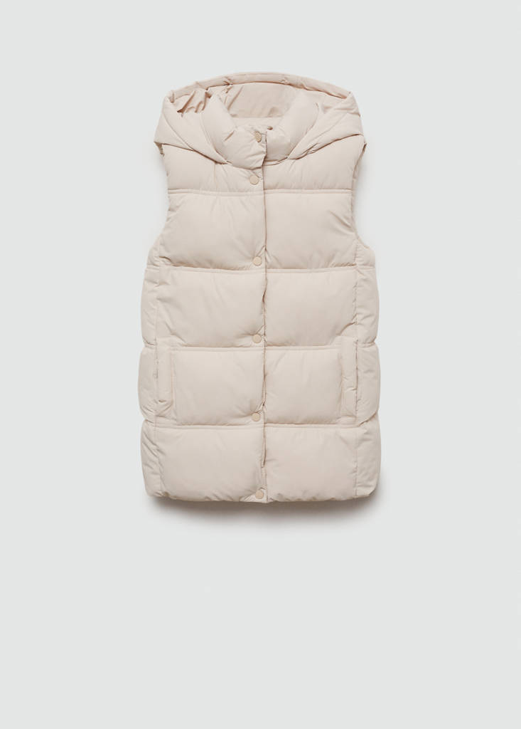 Lang ontwerp. Rechte snit. Gewatteerd ontwerp. Lichte stof. Capuchon. Mouwloos. Twee zakken. Rits- en knoopsluiting