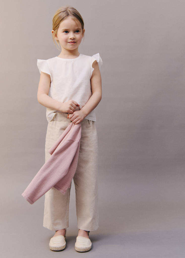 Stofmix van linnen en katoen. Recht ontwerp. Elastische tailleband. Paspelzak aan de achterkant. Knoopsluiting op de taille. Feest-, ceremonie- en communiecollectie