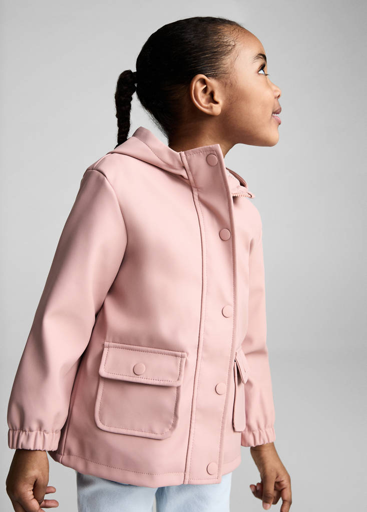 Waterdichte stof. Lange mouwen. Capuchon. Elastische manchetten. Rits- en knoopsluiting. Twee klepzakken met knoop aan de voorkant. Katoenen voering
