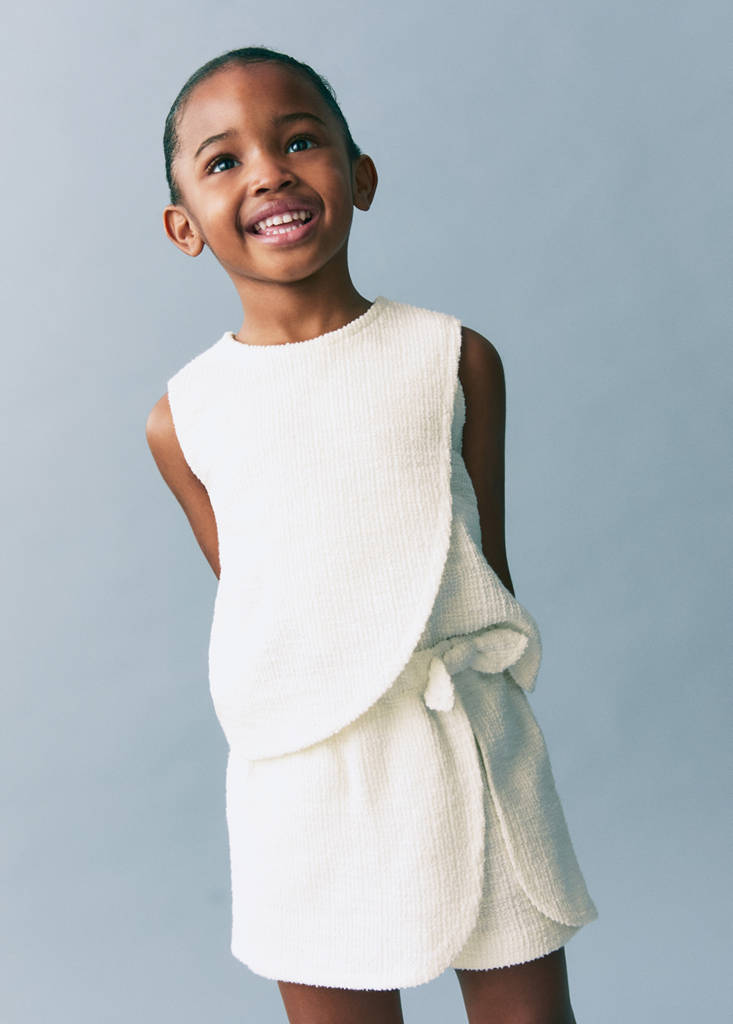 Tweed stof. Katoenen stof. Cropdesign. Recht ontwerp. Ronde hals. Mouwloos. Knopensluiting aan de achterkant. Opening detail. Total look
