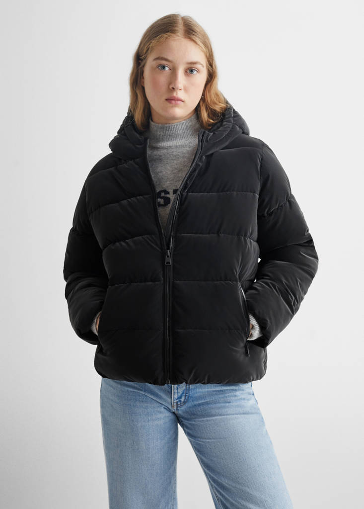 Polyester stof. Kort ontwerp. Gewatteerd ontwerp. Twee steekzakken met rits. Met capuchon