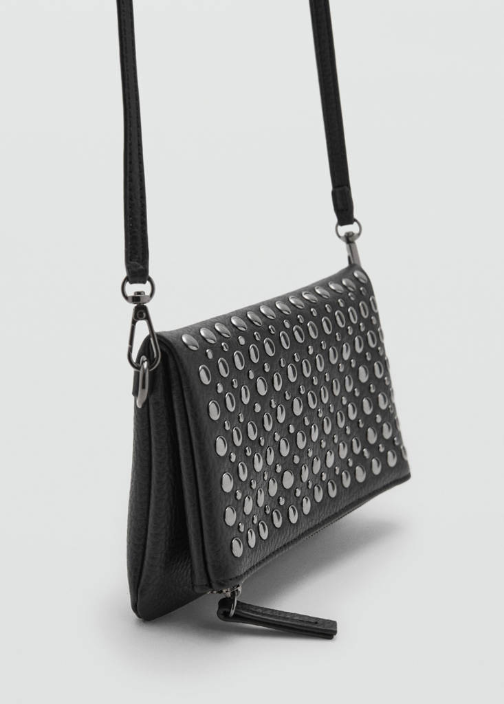 Rechthoekig ontwerp. Detail van studs. Rits- en knoopsluiting. Schouderriem. Lange handvat