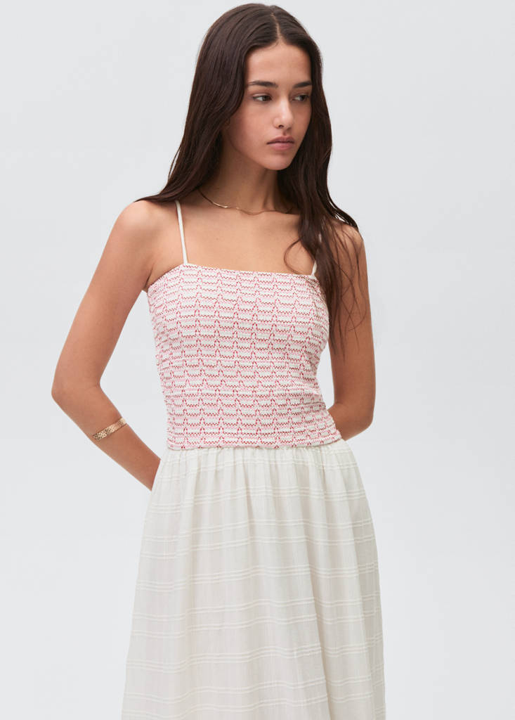 100% katoenen stof. Stof met textuur. Wijd uitlopend model. Lang ontwerp. Honingraatpand. Geborduurd pand. Fijne bandjes. Recht decolleté. Ruche zoom. Binnenvoering
