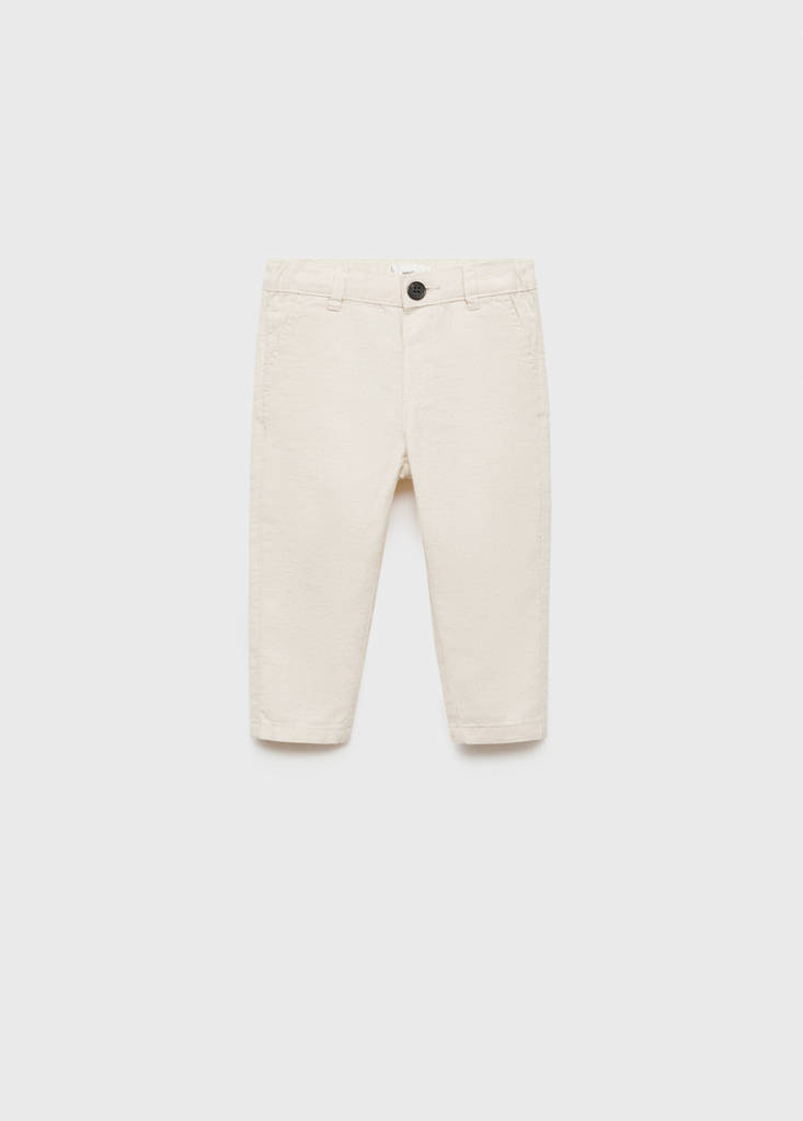 Cotton and linen fabric. Straight design. Chinos style. Two front pockets. Two welt pockets at the back. Belt loops. Elasticated waistband. Button and zip fastening. Party, ceremony and communion collection