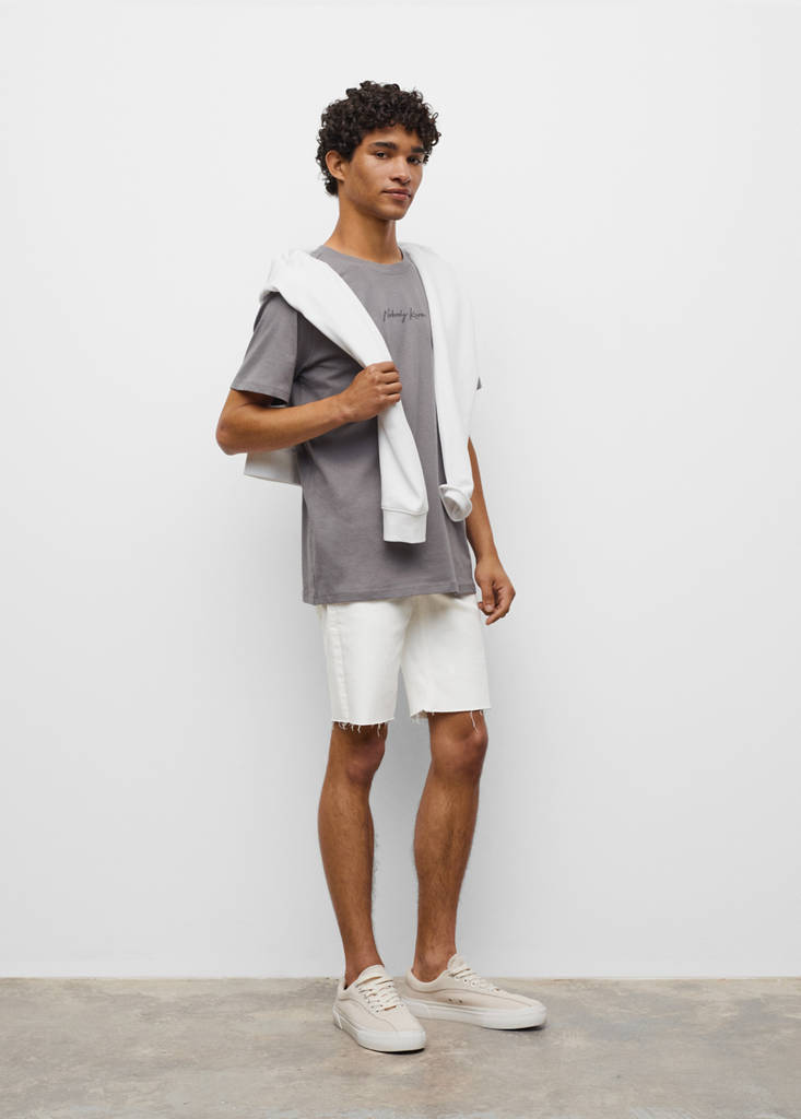 Fabric with cotton. Denim fabric. Straight design. Short design. Five pockets. Frayed hem. Zip and button fastening. Smaller than usual size, we recommended to buy a larger size. Teen collection