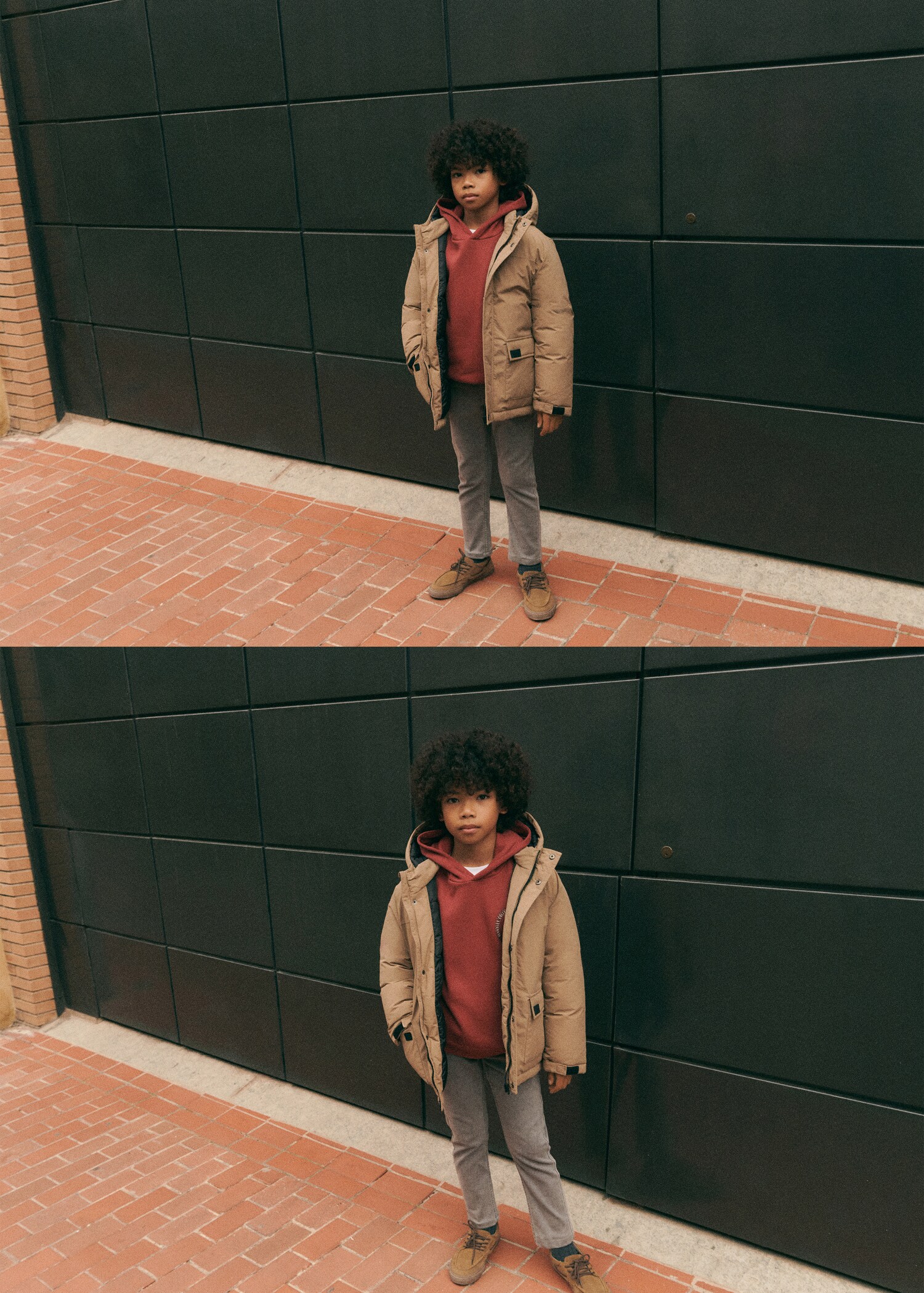 Back to school collection. Front closure. Quilted design. Hood. Straight Design. Long sleeve. With filling. Two side pockets with buttoned flaps. Zip closure.