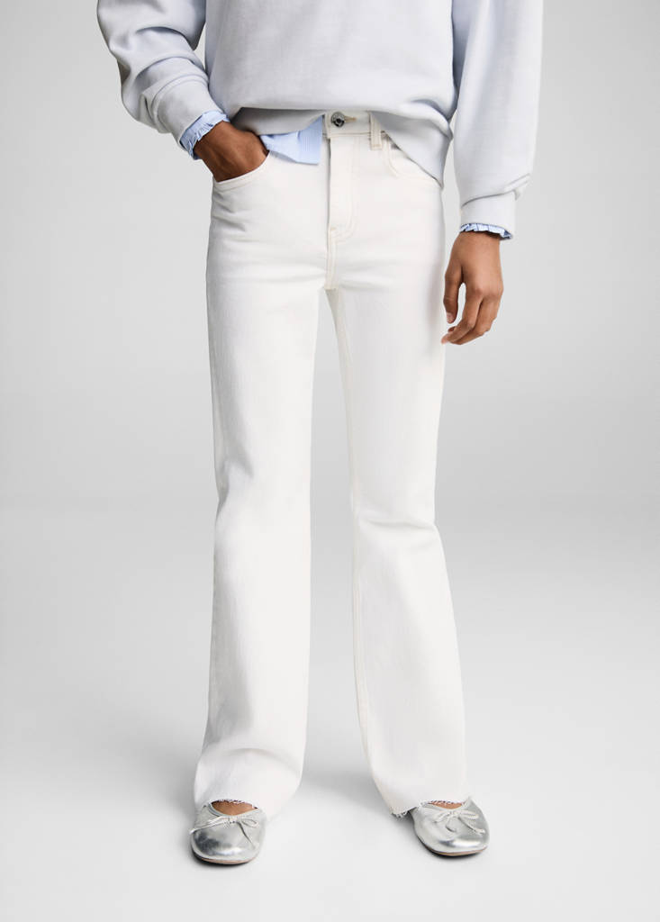 Denim-style cotton fabric. Flare design. Frayed hem. Long design. Five pockets. Zip and button fastening. Contrasting seams