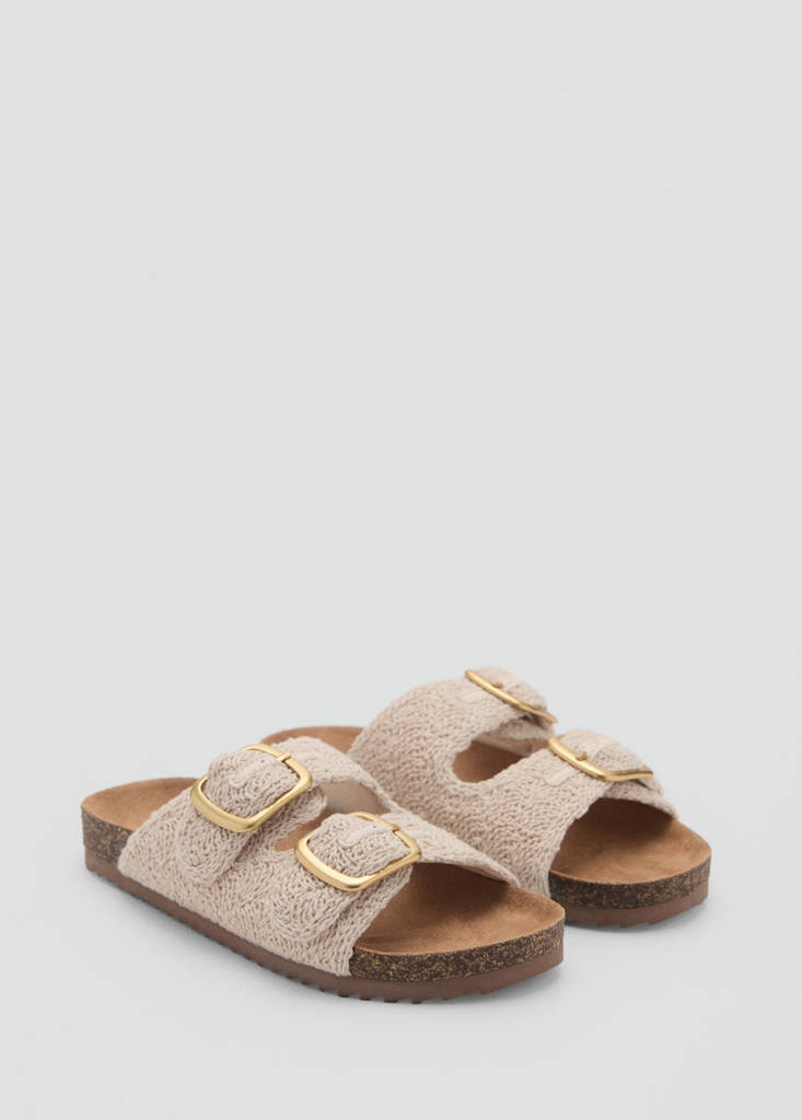 Textured fabric. Straps design. Buckle closure. Rubber sole