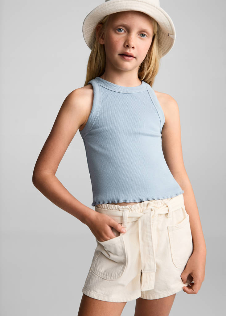 Ribbed strap T-shirtPrice historyInitial price struck through [9.71 € лв. 18.99]9.71 €лв. 18.99Second price struck through [7.15 € лв. 13.98]7.15 €лв. 13.98Current price [1.99 € лв. 3.89]1.99 €лв. 3.89-80%Select a colourBlueSelect your size5-6 years (116cm)Not available. I want it!7-8 years (128cm)Not available. I want it!9-10 years (140cm)Not available. I want it!11-12 years (152cm)Not available. I want it!13-14 years (164cm)Not available. I want it!DimensionsNotify meRibbed knit. Cotton fabric. Straight design. Round neck. Wide straps. Summer campDetails, composition and careStore availabilityItem qualitiesRecycled cottonAt least 20%This fibre is obtained from pre- and post-consumer textile waste that is transformed into new fabrics.