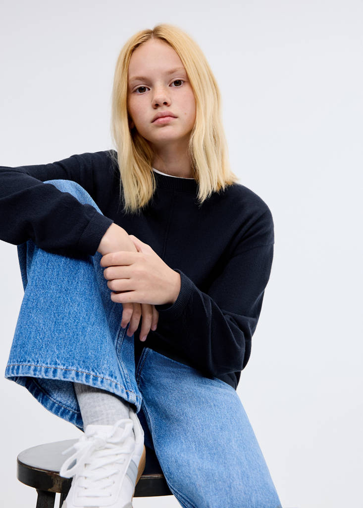 100% cotton fabric. Knitted fabric. Straight design. Round neck. Long sleeves. Ribbed collar, cuffs and hem. Stitching detail on the front