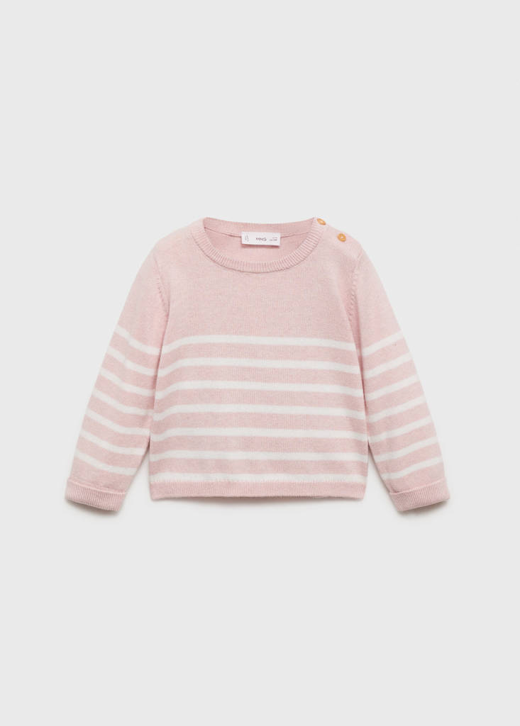 Knit striped sweaterPrice historyInitial price struck through [16.87 € лв. 32.99]16.87 €лв. 32.99Current price [12.99 € лв. 25.41]12.99 €лв. 25.41-23%Select a colourPastel PinkSelect your size1-3 months (62cm)Last few items!3-6 months (68cm)Not available. I want it!6-9 months (74cm)Last few items!9-12 months (80cm)Not available. I want it!12-18 months (86cm)Not available. I want it!18-24 months (92cm)Not available. I want it!MeasurementsAddKnitted fabric. Cotton fabric. Striped design. Straight design. Round neck with button closure. Long sleeves. Ribbed collar, cuffs and hemDetails, composition and careStore availabilityItem qualitiesRecycled cottonAt least 20%This fibre is obtained from pre- and post-consumer textile waste that is transformed into new fabrics.