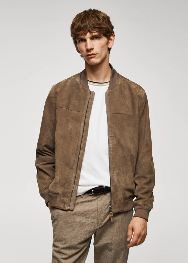100% suede leather. Bomber design. Regular fit. Bomber jacket with ribbed collar. Zip fastening on the front section. Long sleeves with elastic cuffs. Elastic ribbed endings. Two front welt pockets with zipped closures. Inner lining. Inner zipped pocket. Basics Collection. The blue colour is an online exclusive