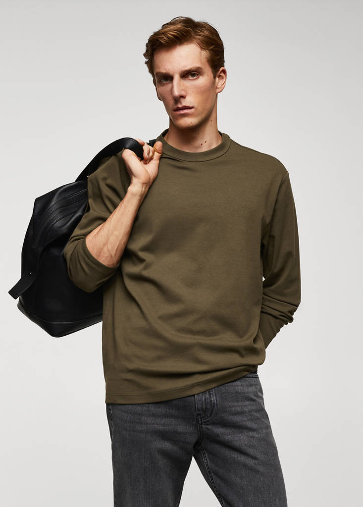 100% Cotton. Regular fit. Lightweight fabric. Round neck with ribbed finish. Long sleeves. Straight hem with side slits