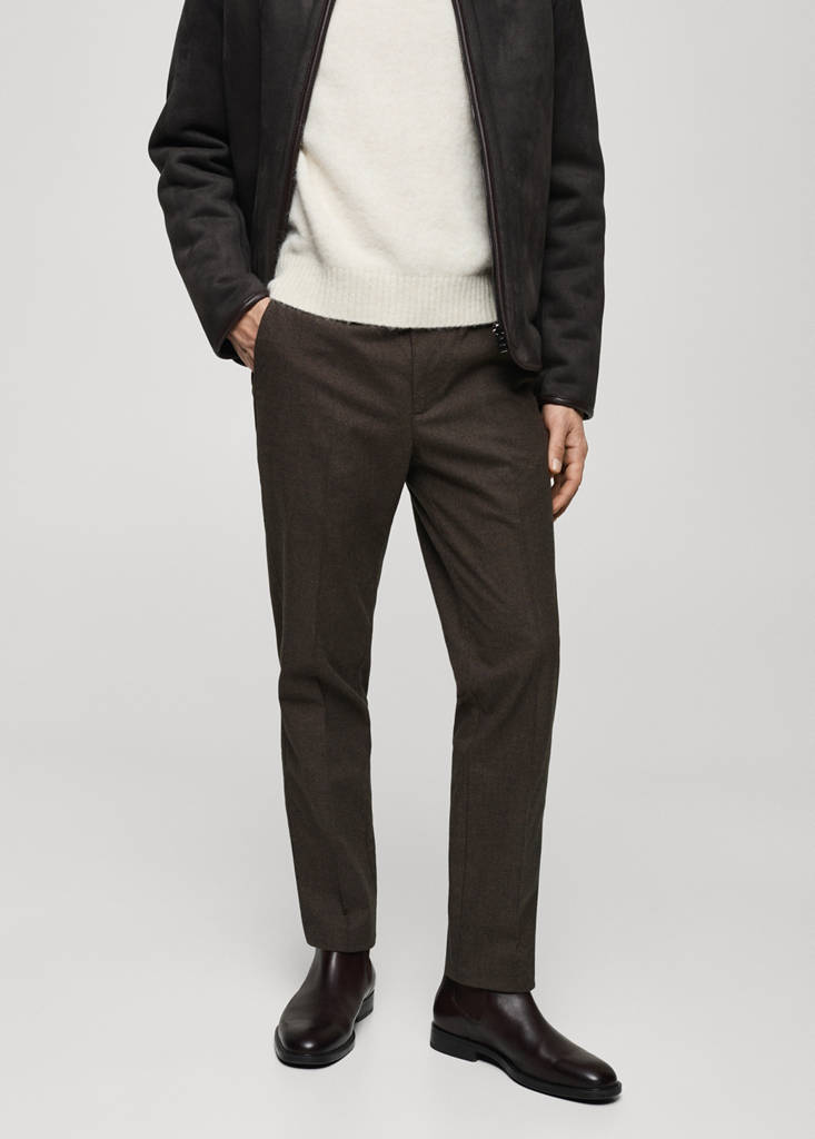 Standard design. Regular fit. Mid-rise. Size: 36x36x36cm. Soft cotton flannel. Pressed crease detail at the front and back. Front fastening with double-breasted buttons and zip. Ticket pocket. Belt loops. Two side pockets. Two welt pockets with button at the back