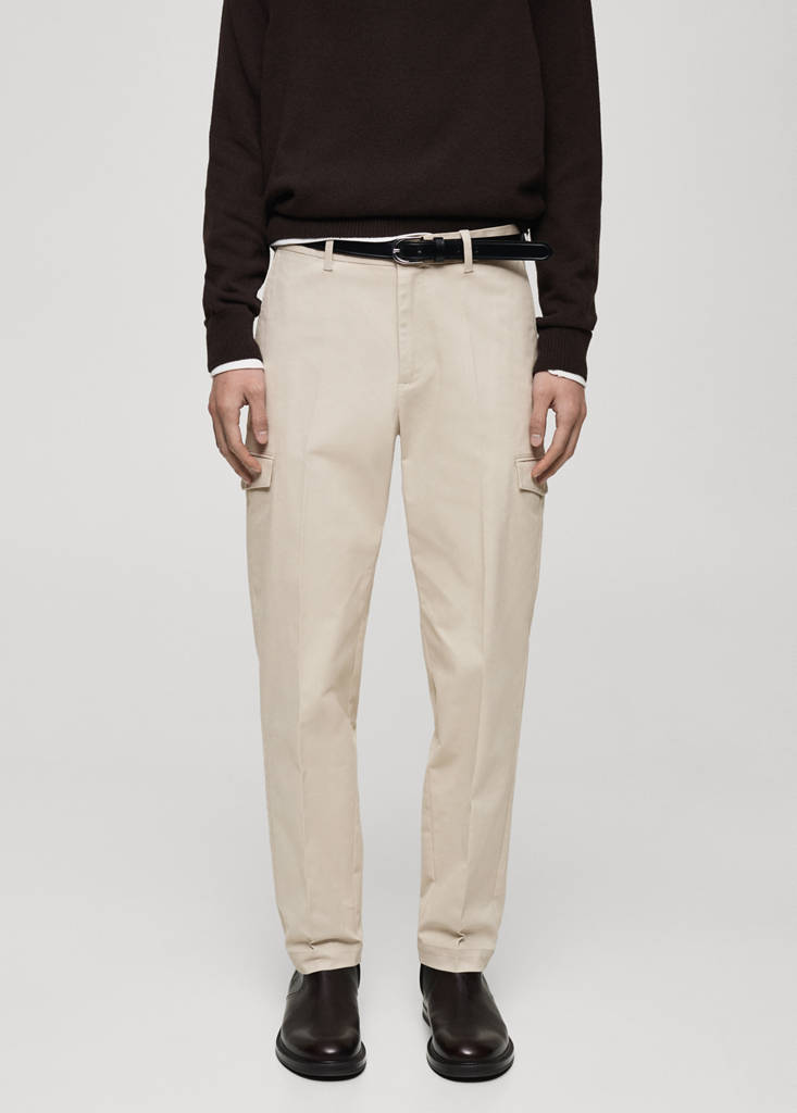 Regular fit. Cotton fabric. Cargo design. Belt loops. Two cargo pockets. Two side pockets. Two welt pockets with button at the back