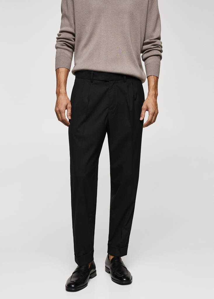 Slim fit. Concealed button, hook and zip fastening. Belt loops. Front pleat detail. Two front pockets. Two pockets with flaps on the back. Cuffed hem. Pressed crease detail at the front and back