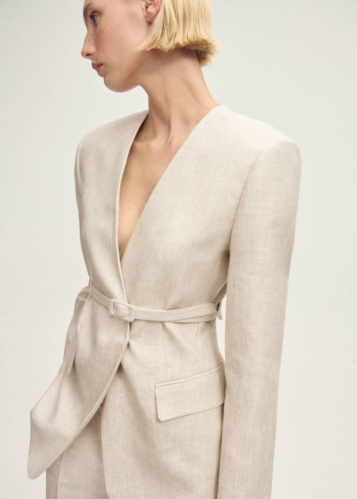 100% linen fabric. Straight design. Wrap design. Pronounced shoulders. V-neck. Long sleeves. Two side pockets with flaps. Belt buckle fastening. Front closure. Suit style. Total look. Selection Collection