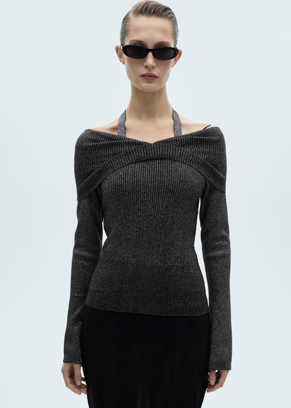 Ribbed knit fabric. Lurex fabric. Off-shoulder design. Fitted design. Off shoulders. Turn-down design. Long flared sleeve. No Fastening. Party and Ceremony Collection.