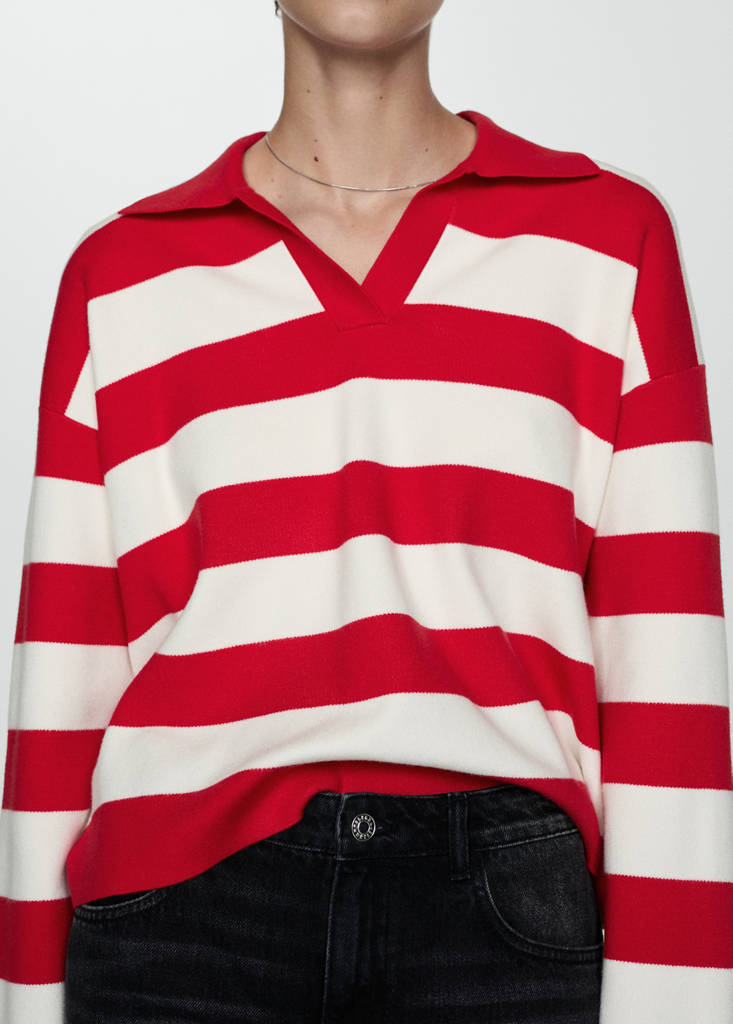 Fine knit fabric. Straight design. Polo collar. Long sleeves. Available Plus. Striped design