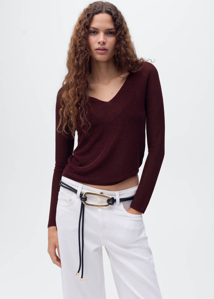 Lurex fabric. Fine knit fabric. Straight design. V-neck. Long sleeves. No Fastening. Available Plus. Party, ceremony and communion collection. Standard design. Standard Length. Long Sleeve Length. Straight Silhouette. Fine Knit Structure. Peak Lapel. This garment is part of our party and event collection, designed to elevate your looks for special occasions