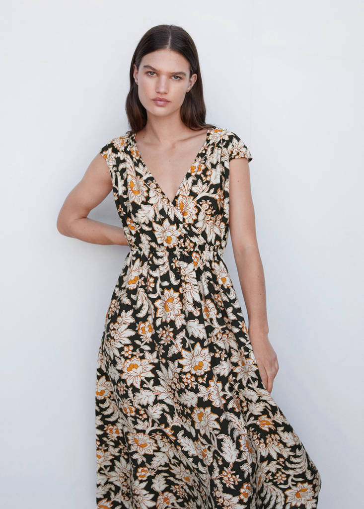 Fluid fabric. Wrap design. Floral design. Long design. V-neck. Short sleeves. V-neckline in the back. Bow fastening on the back. Elasticated waistband