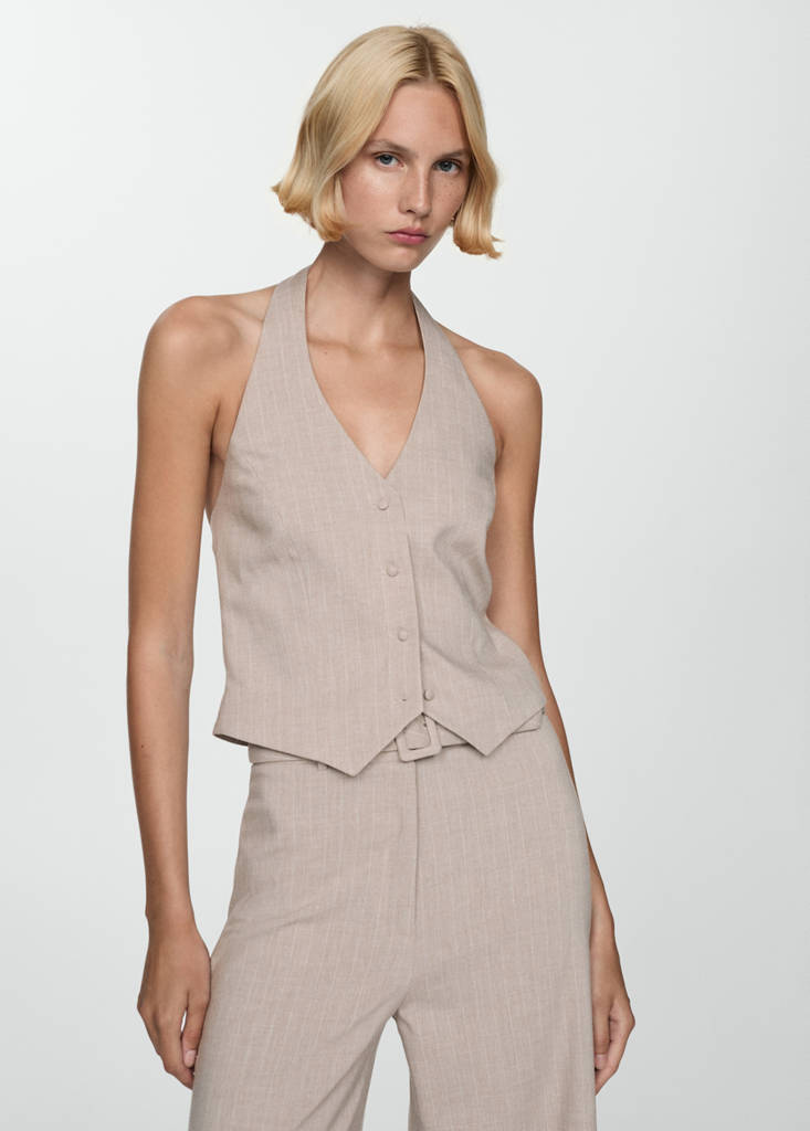Pinstripe pattern. Short design. Halter neck. V-neckline. Sleeveless. Button fastening at the front. Total look. Fitted design