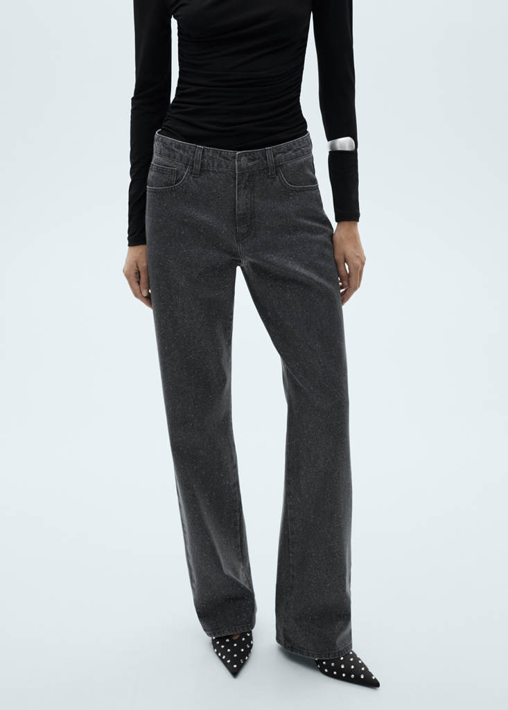 Denim-style cotton fabric. Shiny finish. Straight design. Mid-rise. Belt loops. Five pockets. Zip and button fastening. Party, ceremony and communion collection