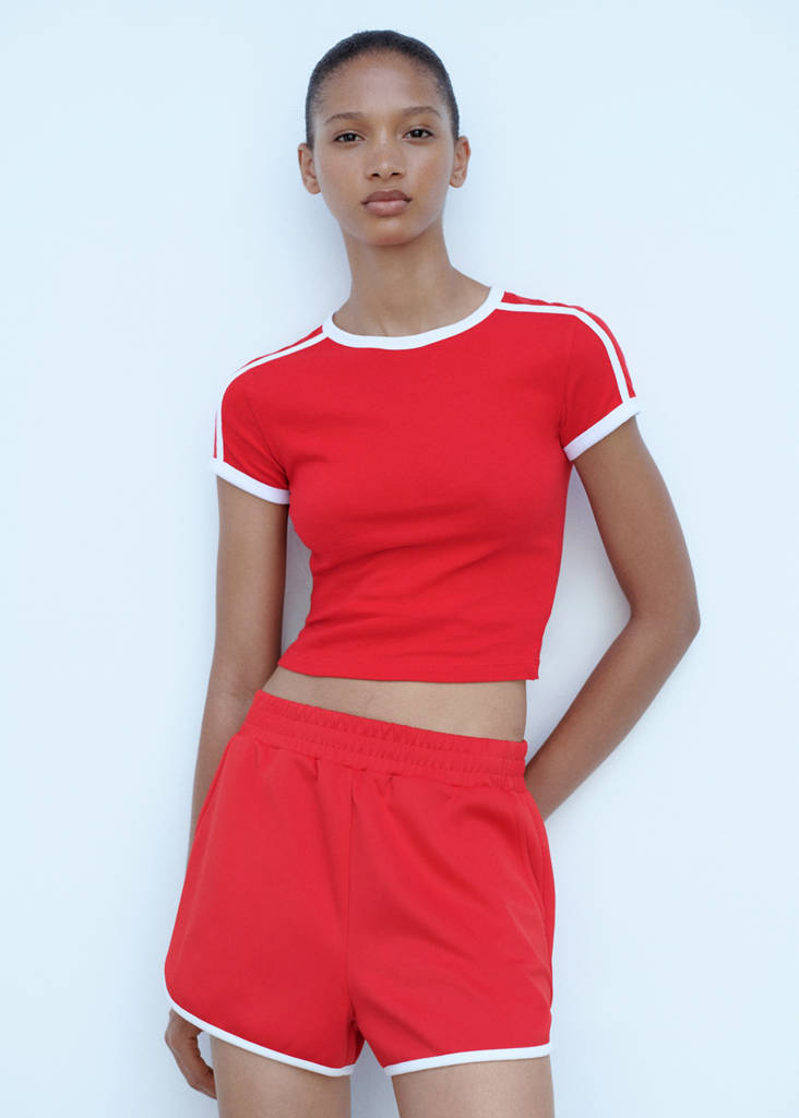 Short design. Straight design. Two side pockets. Elasticated waistband. No Fastening. Contrasting finishes. Total look