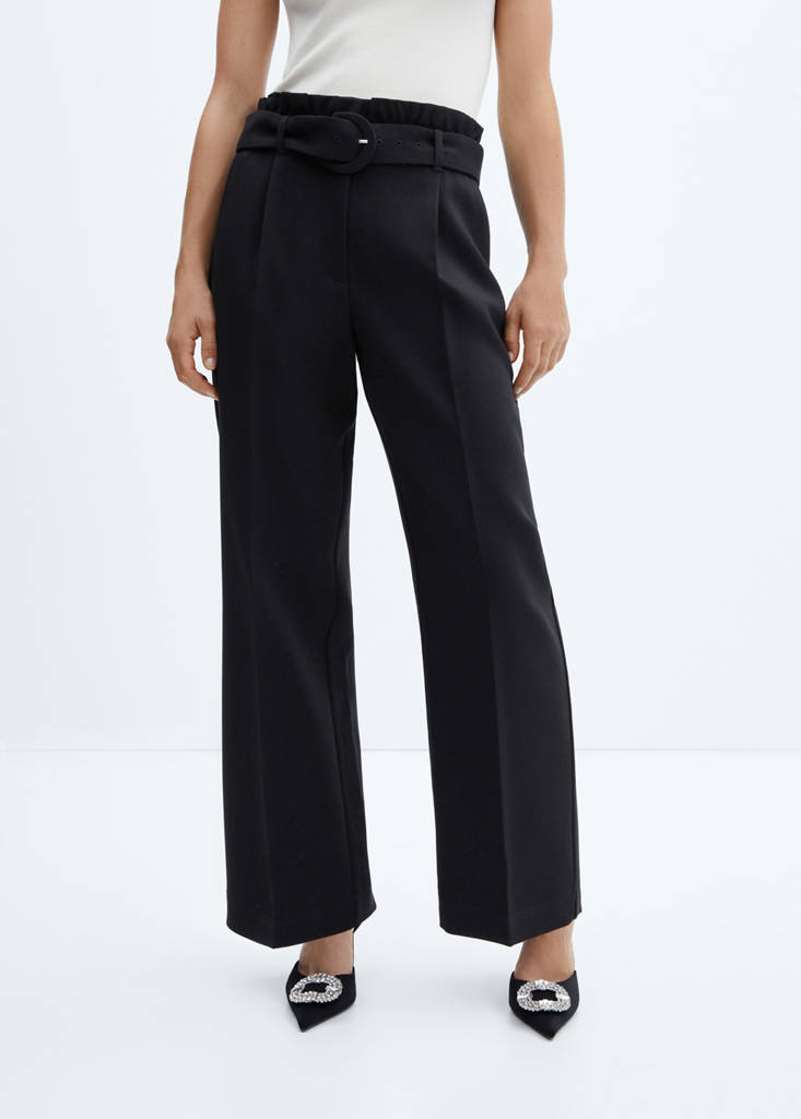 Fluid fabric. Paperbag. Crop design. Straight design. Concealed button, hook and zip fastening. Adjustable belt. Belt loops. Two side pockets. Available Plus. Office looks