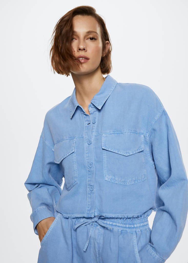 Leinen. Oversize-Design. Crop-Design. Hemdkragen. Lange Ärmel mit Knöpfen an den Enden. Zwei Pattentaschen auf Brusthöhe. Ausgefranste Abschlüsse. Knopfverschluss vorne. Total Look