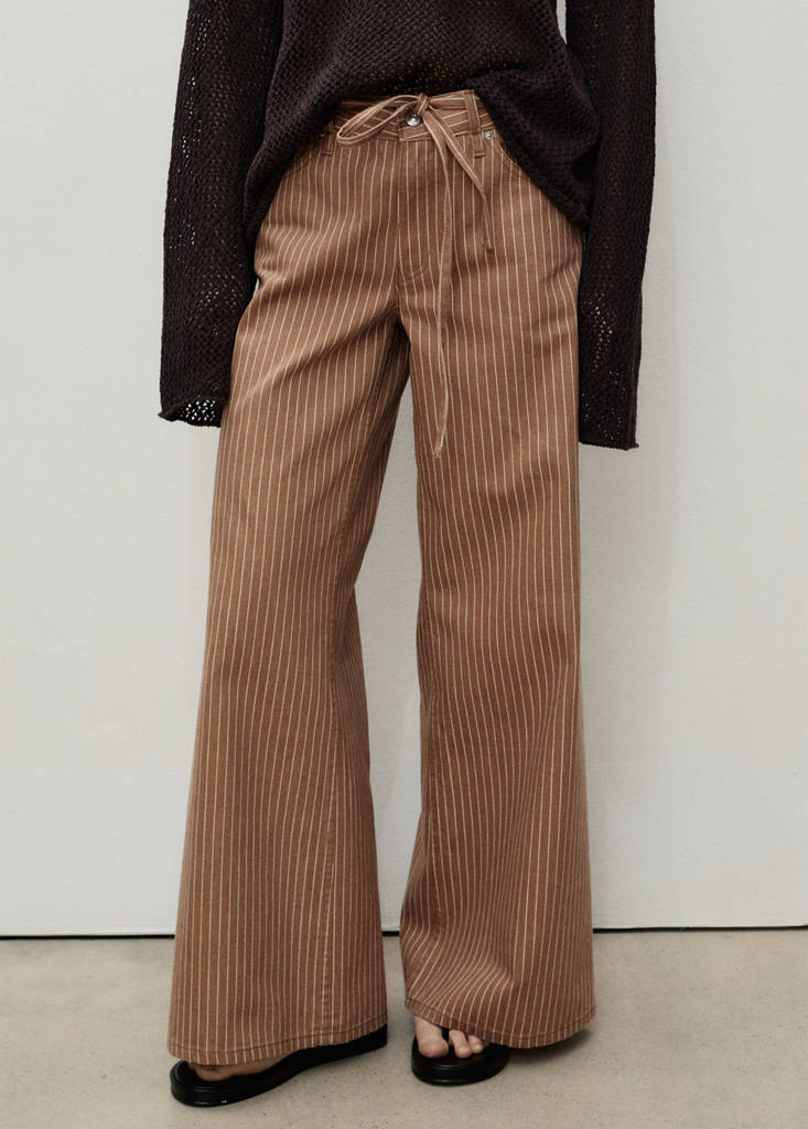 Baumwollstoff im Jeans-Stil. Langes Design. Wide-Leg-Design. Streifenmuster. Tiefer Sitz. Gürtelschlaufen. Fünf Taschen. Abnehmbarer Gürtel. Reißverschluss und Knopfverschluss vorne