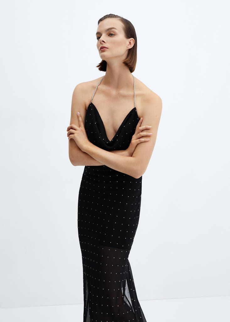 Fließender Stoff. Langes Design. Halbtransparentes Design. Strass-Dessin. Drapierter Ausschnitt. Ärmellos. Rückenausschnitt. Verdeckter Reißverschluss hinten. Rückenschlitz am Saum. Dekorative Glitzer-Applikationen. Futter. Kollektion für Partys, Feierlichkeiten und Kommunionen