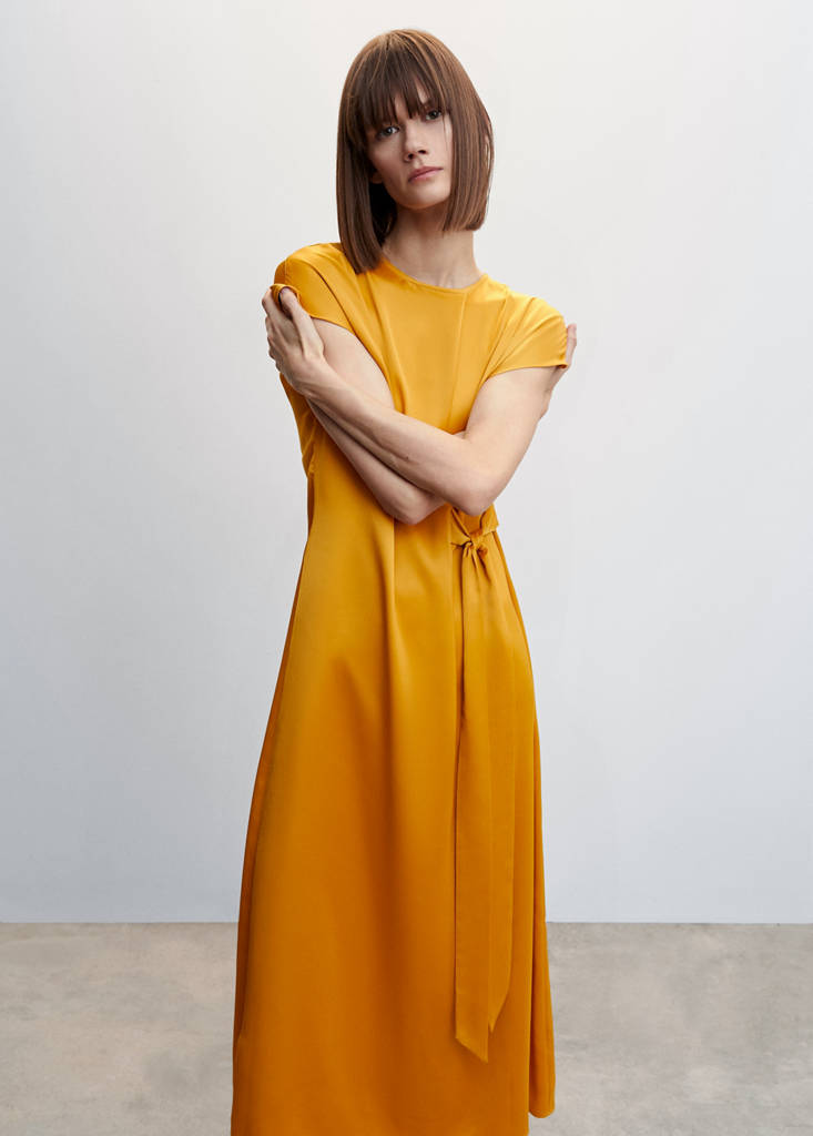 Satin. Fließender Stoff. Gerades Design. Mid-Design. Zierschleife. Kurze Ärmel. Rundhalsausschnitt. Knopfverschluss am Kragen