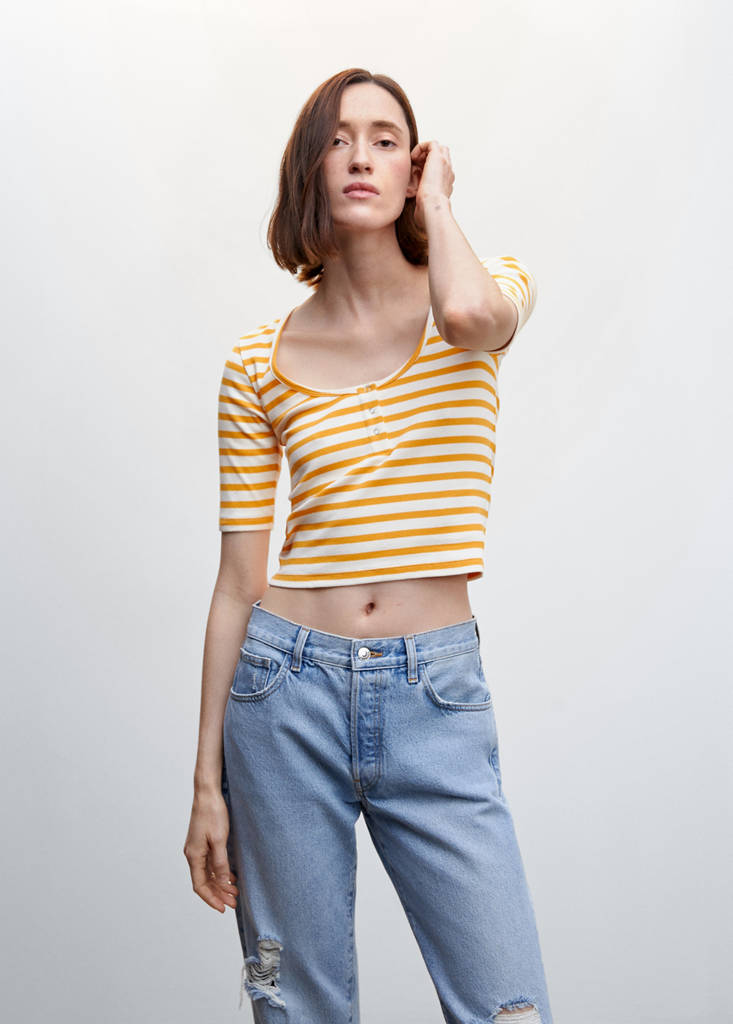 Gestreiftes Rippen-T-Shirt Ausgangspreis durchgestrichen [CHF 19.95 ]CHF 19.95Aktueller Preis [CHF 10.95 ]CHF 10.95-45%Wählen Sie eine FarbeGelbWählen Sie Ihre GrößeXSNicht vorrätig. Ich will es!SNicht vorrätig. Ich will es!MNicht vorrätig. Ich will es!LNicht vorrätig. Ich will es!XLNicht vorrätig. Ich will es!MaßeBenachrichtigenBaumwoll-Mischgewebe. Rippstrick. Streifenmuster. Kurzes Design. Schmaler Schnitt. Rundhalsausschnitt. Kurze Ärmel. Druckknopfverschluss vorneDetails, Zusammensetzung und PflegehinweiseVerfügbarkeit im Geschäft