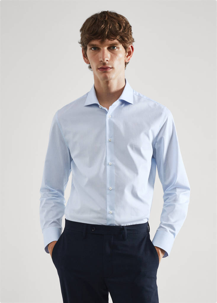 Slim Fit. 100 % Baumwolle. Baumwoll-Twill-Struktur. Feines Karomuster. Haifischkragen. Vorderer Verschluss mit Knöpfen. Abgerundeter Saum. Geknöpfter langer Ärmel. Lange Ärmel mit Knopfmanschetten