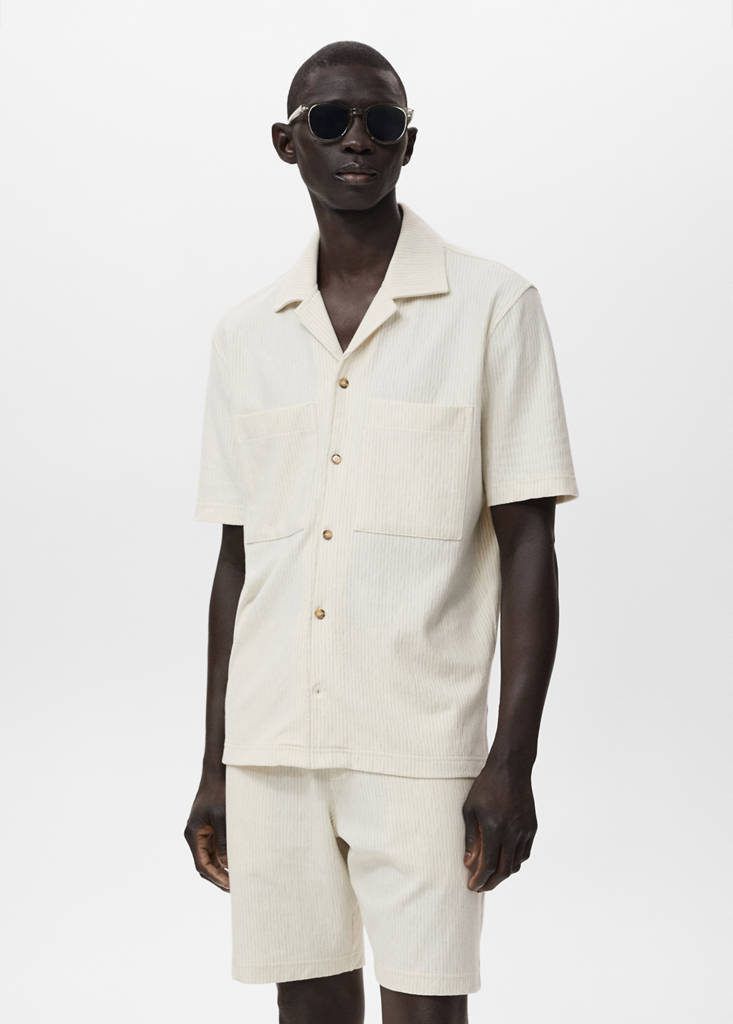 Relaxed Fit. Stoff: 95 % Baumwolle. Streifendetail. Bowlingkragen. Vorderer Verschluss mit Knöpfen. Zwei Brusttaschen. Gerader Saum. Kleine seitliche Schlitze am Saum. Set erhältlich als Total-Look