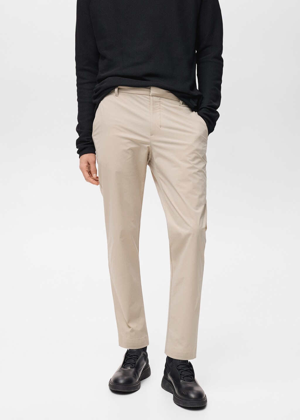 Performance-Kollektion. Wärmeregulierend: Dieses Gewebe bietet optimale Atmungsaktivität, um Ihre Körpertemperatur konstant zu halten. Comfort Stretch: Stretch-Stoff für zusätzlichen Komfort. Slim Fit. Elastischer Bund mit verstellbarem Kordelzug. Vorderer Verschluss mit doppelter Knopfleiste und Reißverschluss. Zwei vordere Paspeltaschen. Zwei rückwärtige Leistentaschen und Pattentaschen.