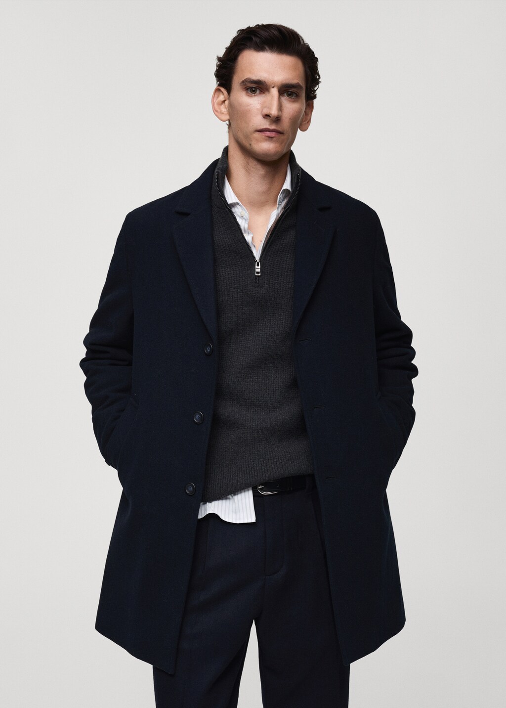 Die Farbe Blau gibt es nur online. Gerader Schnitt. Woll-Mischgewebe. Gestepptes Innenfutter. Reverskragen. Vorderer Verschluss mit Knöpfen. Lange Ärmel. Rückenschlitz am Saum. Innentasche. Langes Design. Fallendes Revers. Drei-Knopf-Verschluss vorne. Zwei seitliche Paspeltaschen. Knopfmanschetten. Öffnung in der Saummitte.