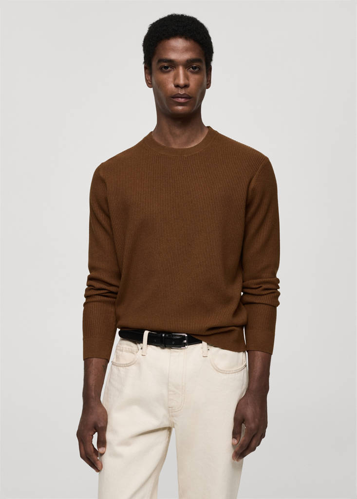 Die Modelle in Schokoladenbraun und Himmelblau sind exklusiv online erhältlich. Baumwollmischgewebe. Rippstrick. Rundhalsausschnitt. Lange Ärmel mit elastischen Bündchen. Gerader Saum. Gerippte Abschlüsse an Kragen, Ärmel und unterem Saum