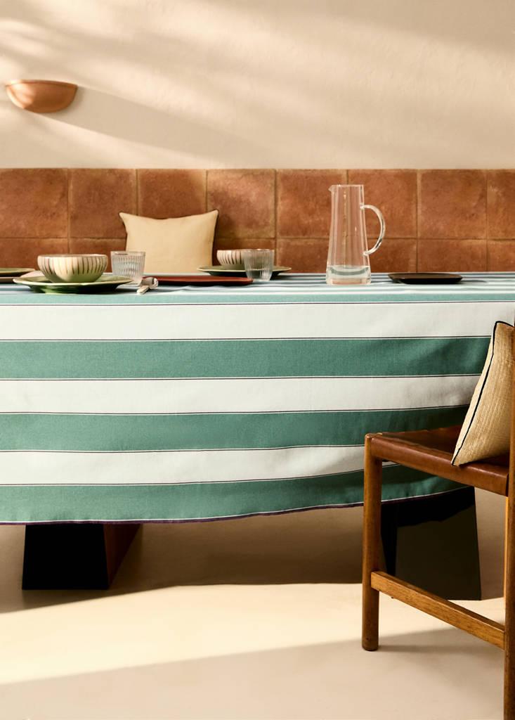 100% Baumwolle. Größe: 150x150cm. Für 2 bis 4 Personen. Streifenprint, kunstharzbeschichtet. In zwei Größen erhältlich. In verschiedenen Farben erhältlich