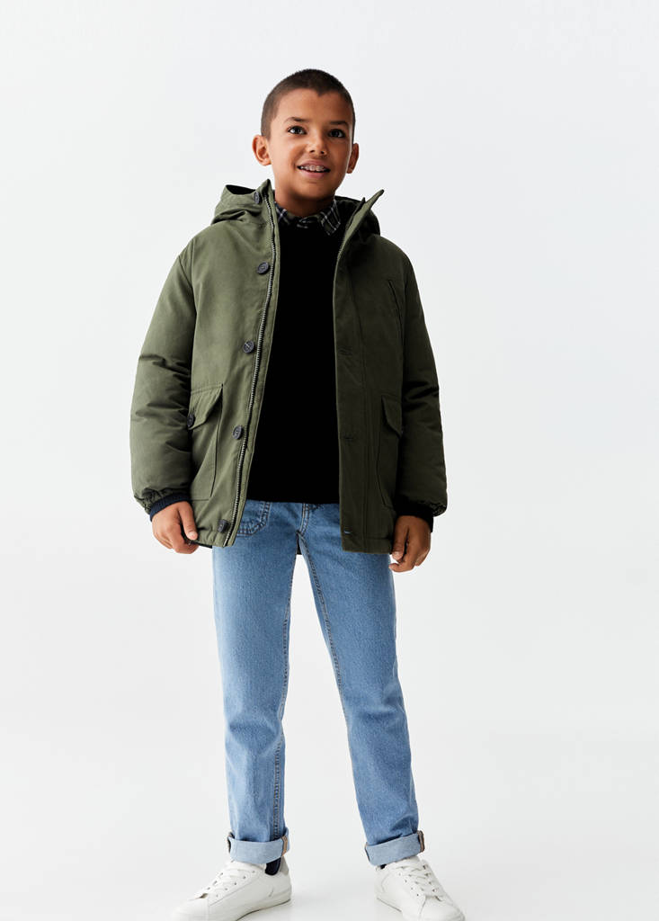 Gestepptes Design. Gerades Design. Lange Ärmel. Kapuze. Zwei Seitentaschen mit Knopf. Vorderer Verschluss. Reißverschluss und Knopfverschluss. Etikett an der Innenseite für persönliche Daten