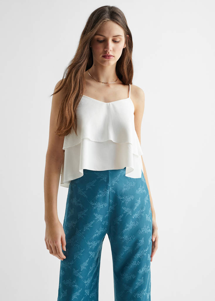 Gewebe: Polyester. Crop-Design. Volant-Dessin. Spaghettiträger. Ohne Verschluss. V-Ausschnitt. Ärmellos