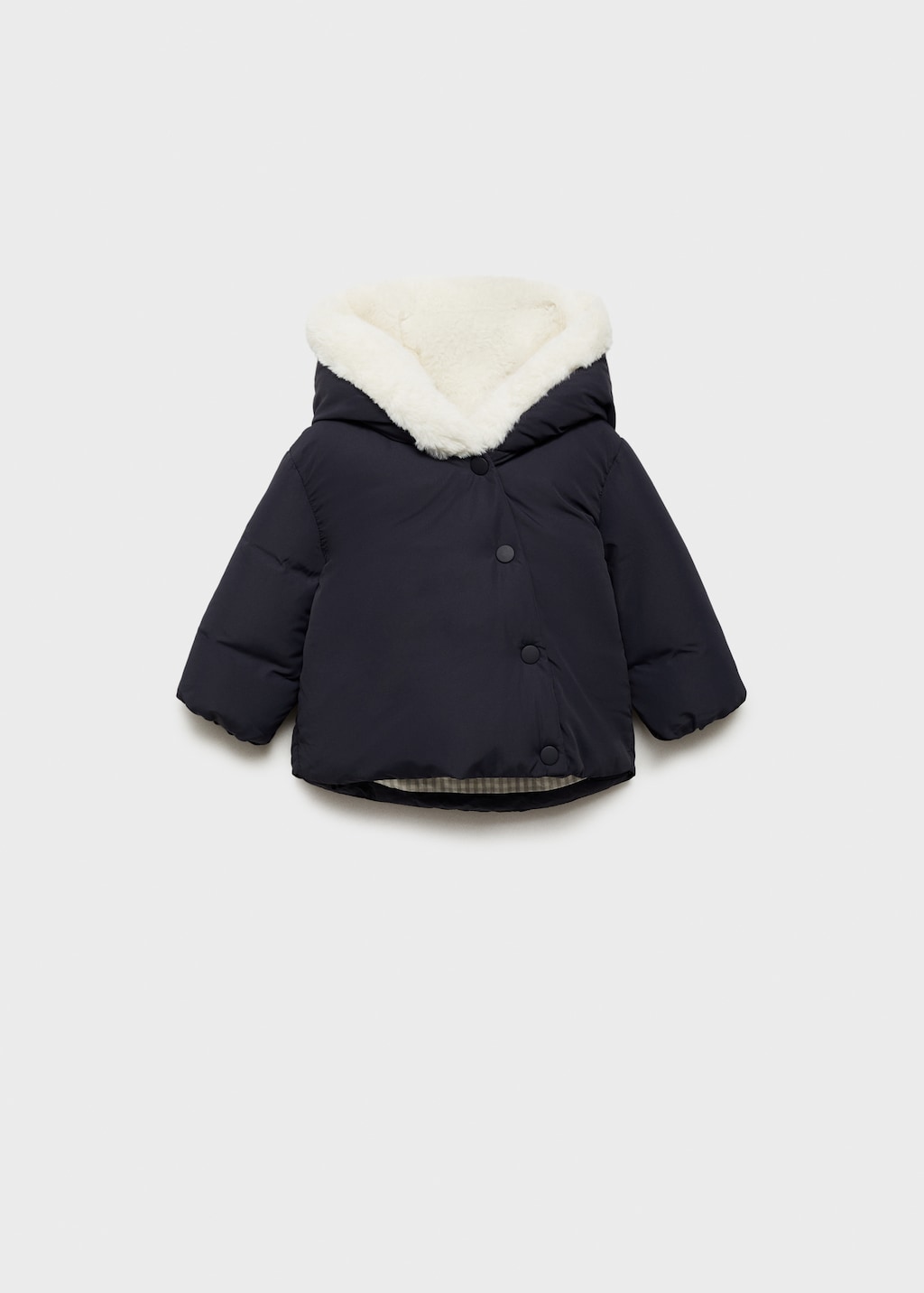 Gerades Design. Gestepptes Design. Kapuze. Kapuze mit Detail aus Kunstpelz. Langarm. Futter. Etikett für persönliche Daten. Druckknopfverschluss.