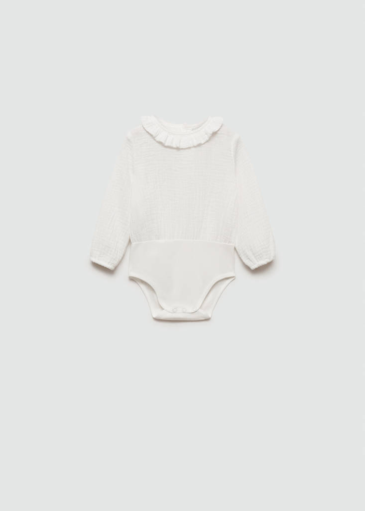 100% Baumwolle. Bambula-Stoff. Gerades Design. Rundhalsausschnitt. Body mit Rüschenkragen. Lange Ärmel. Druckknopfverschluss