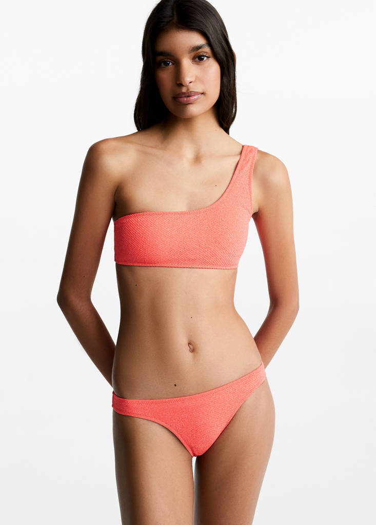 Bademode-Kollektion. Lurex-Gewebe. Klassischer Slip. Bund mit Gummizug. Herausnehmbares Schaumstoffpolster. Ohne Verschluss