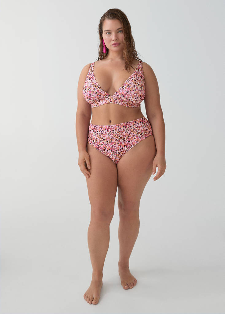 Imprimé floral. Motif triangulaire. Encolure en V. Bretelles ajustables. Bretelles larges. Mousse amovible. Fermeture agrafe réglable. Doublure. Ensemble disponible. Collection bain. Exclusif Plus. Disponible en grande taille