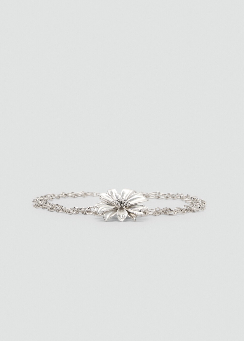 Chaîne fine métallique. Ornement fleur. Fermoir à chaînette et mousqueton. Collection fête et cérémonie.