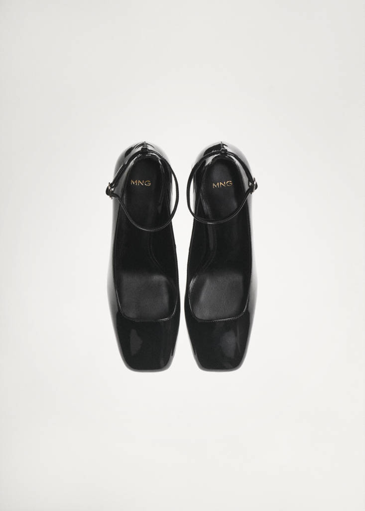Effet verni. Talon bloc. Bout carré. Fermeture à boucle. Bride de cheville. Talon de 7 cm