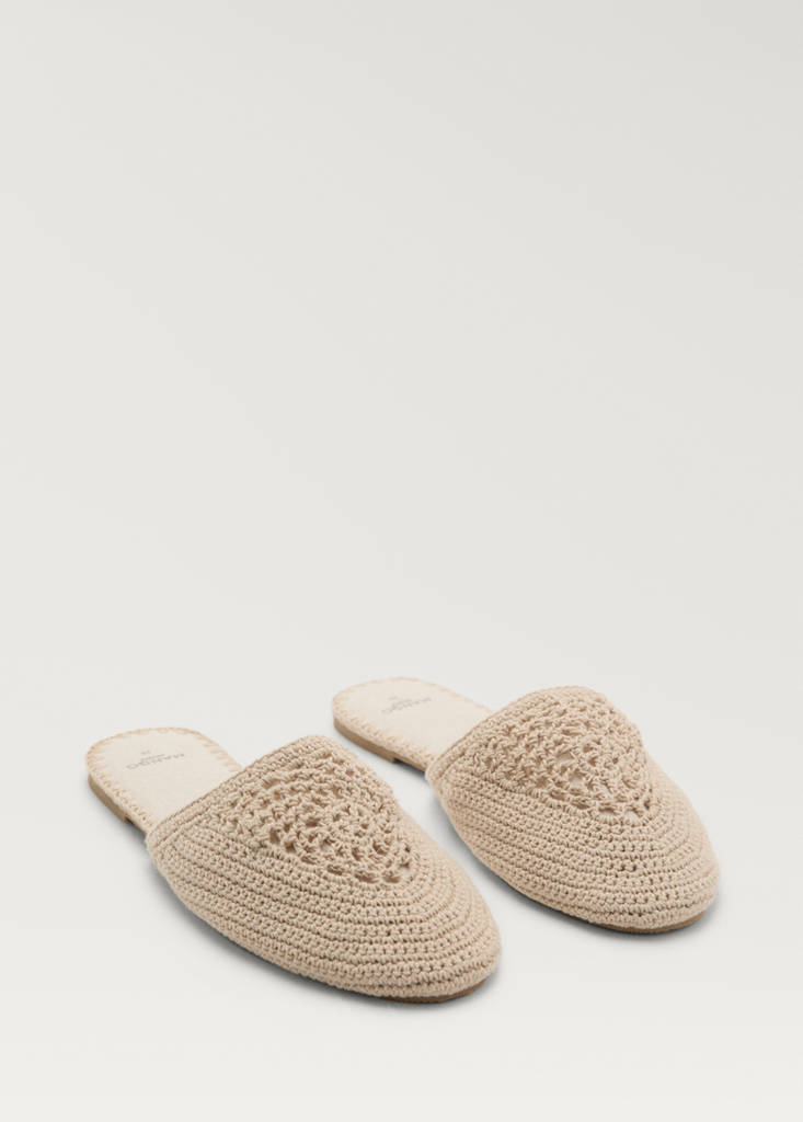 Tissu en coton tressé. Ces mules affichent un design élégant et artisanal, parfaites pour des moments de détente ou pour apporter une touche originale à un look casual. La doublure et la semelle intérieure sont réalisées en 100 % coton, pour une sensation douce, confortable et respirante. L’empeigne est également en coton, avec une finition crochetée qui lui confère un aspect délicat et fait main. La semelle est en caoutchouc thermoplastique, garantissant durabilité, souplesse et bonne adhérence. Ces mules sont ouvertes à l’arrière, laissant le talon découvert, pour un enfilage facile au quotidien. Allie fonctionnalité et élégance