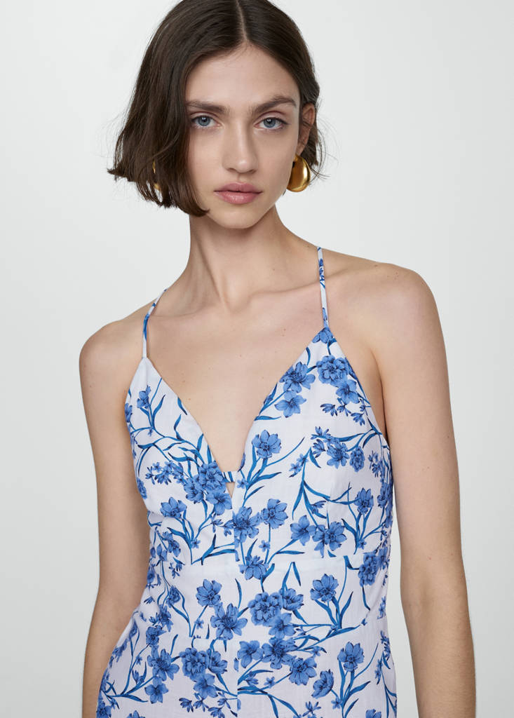 Design long. Coupe droite. Imprimé floral. Encolure en V. Bretelles fines croisées à l'arrière. Fermeture à nouer à l'arrière. Ouverture à l'arrière. Tissu 100 % coton